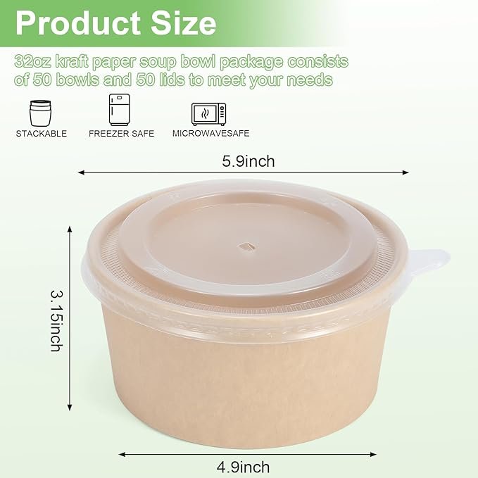 - -Convenient Meal Prep: Our paper bowls with lids are perfect for meal prep, allowing you to easily store and transport your meals with their 32 Oz capacity, ideal for both hot and cold foods.
