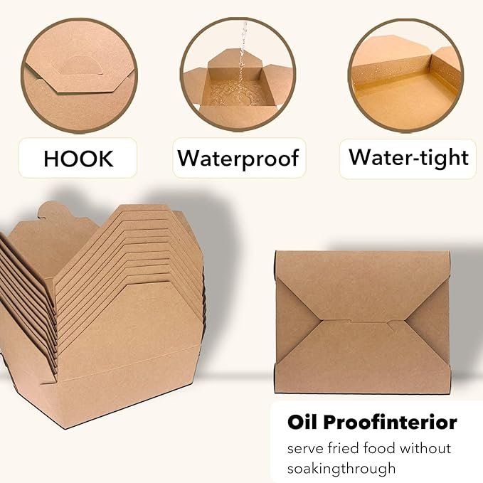 • Size and Capacity: 50 pack of kraft paper to go boxs with lids, upper size: 8.6″ x 6.3″ x 2.5″, lower size: 7.6″ x 5.5″ x 2.5″ and has a capacity of up to 70 ounces 2000 ml. This standard size is suitable for buying a lunch takeout