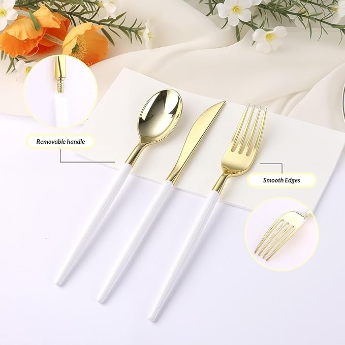 • Exquisite Design: These plastic utensil sets are beautifully crafted with an elegant design; the gold silverware features a smooth surface, showcasing a two-tone color scheme of gold and white; elevate your party to with our disposable utensils